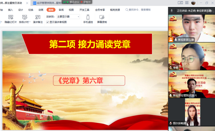 为进一步增强党员的纪律规矩意识、强化党员党性观念、锤炼党性修养,全院党员通过齐声诵读、接力诵读等方式诵读《党章》。通识学院党总支党员通过集体诵读更加明确要坚持把党章作为日常行为根本准则去贯彻落实,要以党章为参照自警自省。经济管理学院党总支通过接力诵读进一步提振了党员精气神和自豪感,强化了遵守、贯彻、维护党章的思想自觉和行动自觉,更加坚定了牢记初心使命、勇于担当作为的责任感和使命感。