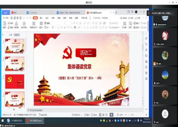 各党组织通过线上形式,组织党员师生分享诵读红色经典故事、诗歌,感悟红色经典,汲取奋进力量。招就中心、财务处、保卫处联合党支部集体诵读了李大钊同志散文《青春》节选,党员干部用饱含深情的诵读,将大家的思绪带回到那个战火纷飞的年代,纷纷表示要继续展现昂扬向上的精神面貌,奋力开创工作新局面。师范教育学院党员教师朗诵的诗歌《十月》,饱含深情地赞颂了祖国翻天覆地的变化,歌颂了祖国的日益强大,同时也激发了党员教师为祖国建设拼搏奋斗的决心。