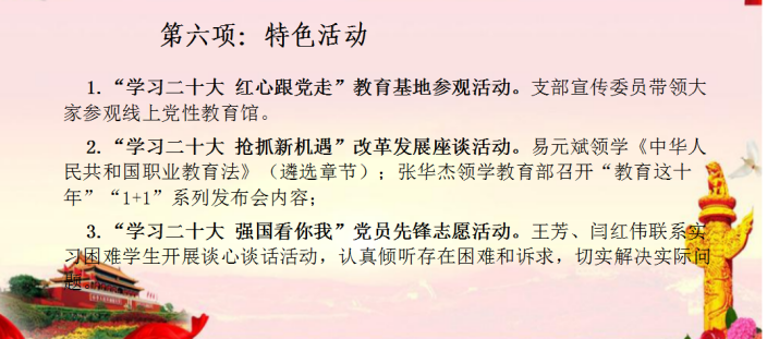 各党组织积极开展《中华人民共和国职业教育法》、教育部召开“教育这十年”“1+1”系列发布会--介绍党的十八大以来职业教育改革发展成效等内容的集中学习,并从中汲取经验、梳理短板、谋划未来。师范教育学院党总支积极同援疆院校盐城师范专科学校对接,就基层党建工作、师资队伍建设、教学科研发展等工作进行交流座谈,座谈会打开了工作思路,为后期工作夯实基础。