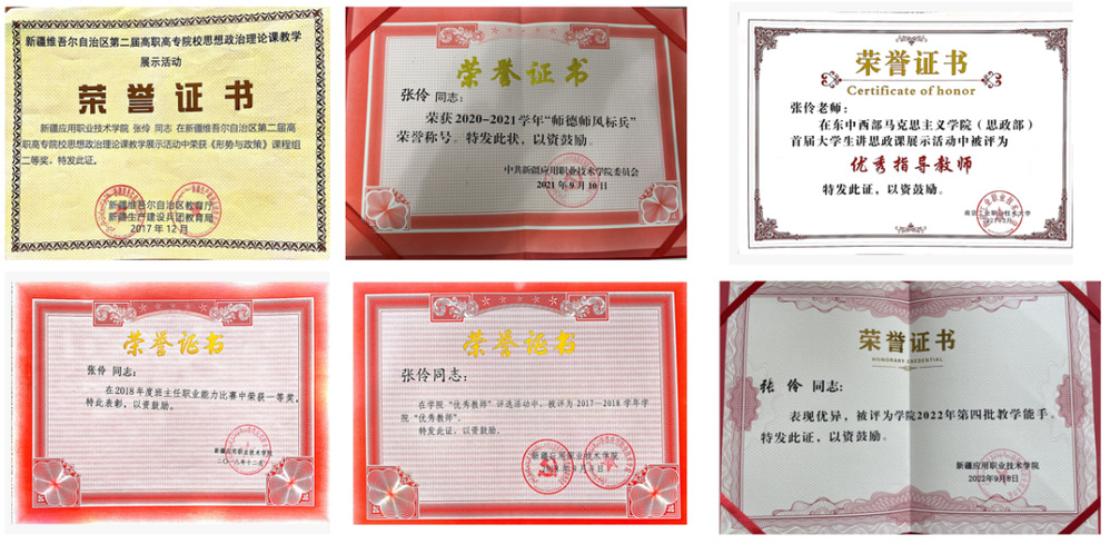 在不断求索的过程中逐渐成长,张伶也得到了大家的认可,在班主任职业能力大赛中荣获一等奖,在思政课教坛新秀大赛中荣获一等奖,指导学生拍摄的《微光·热爱》获得“东中西首届大学生讲思政课二等奖”,2022年获得学院三八红旗手、教学能手等荣誉称号。