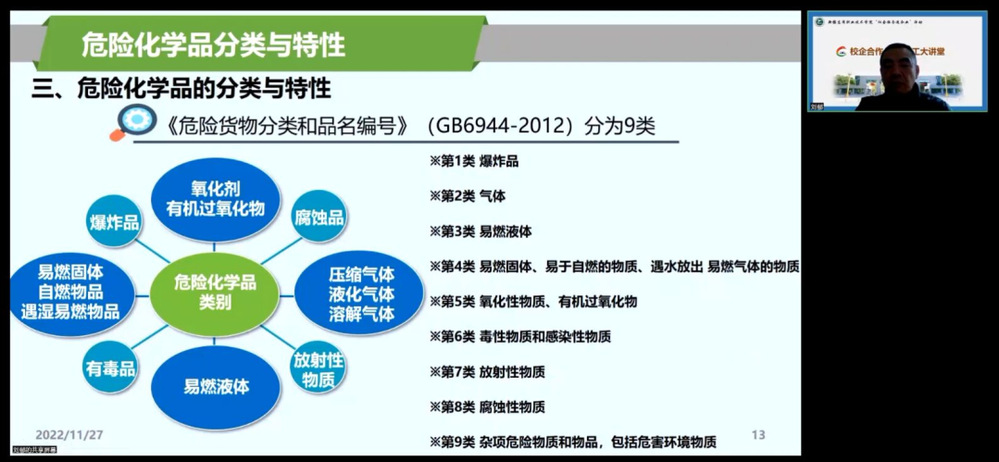 第一期讲座于11月27日举行,邀请江苏省“青蓝工程”青年学术带头人,全国化工职业教育教学团队带头人刘郁教授主讲,讲座吸引来自新疆蓝山屯河聚酯有限公司、博达环保科技有限责任公司、川宁生物、哈密恒有能源化工科技有限公司、合盛硅业、锦疆化工有限公司等12家企业,共计100余人聆听了讲座。讲座介绍了危险化学品定义、分类与管理相关知识,讲座中引用了大量现场图片、真实案例,内容生动、实用。化工行业属于高危行业,希望通过此次讲座向企业员工传递“慎终如始,则无败事;持之以恒,方能善始善终”的理念,同时引导员工和实习学生牢固树立“安全第一”的观念,培养爱岗敬业精神,也对自身安全行为引起足够的重视。